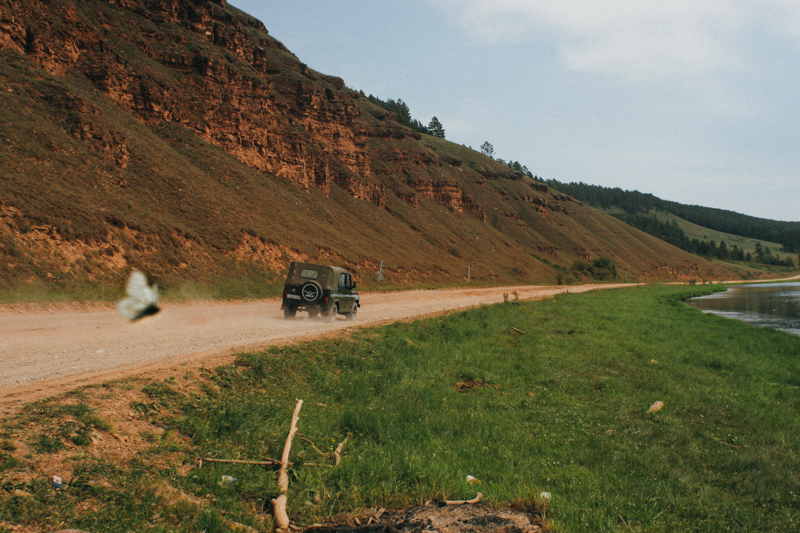 Już teraz jesteśmy zachwyceni widokami, a następny postój okaże się jeszcze bardziej bajeczny. Wysiadamy z samochodu nad rzeką. Na brzegu pełno jakichś owadów. Przyglądamy się bliżej - to motyle. Cała plaża w motylach! Oprócz nas na poboczu stoi czarne Audi i dobrze mi znany UAZ. Robię kilka zdjęć, Tata rozmawia z Igorem i resztą “postojowiczów”, Michał bawi się z motylami.