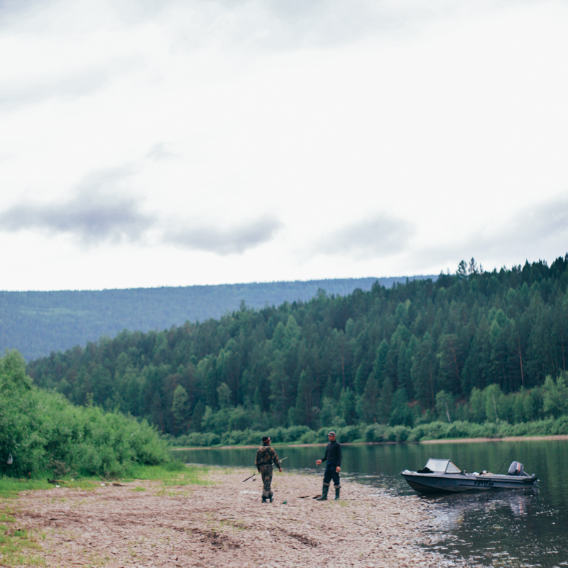 Odbijamy od brzegu i płyniemy dalej. Już nie chce mi się spać. Michał kombinuje z kostką rubika - mnie zdążyła już znudzić ta zabawka. Po godzinie spotykamy pierwszych ludzi na rzece - na zakręcie dwóch rybaków zarzuciło wędkę. Przybijamy do kamienistej plaży i nawiązujemy rozmowę. Okazuje się, że w siedem godzin zrobiliśmy dwadzieścia kilometrów. W takim tempie na pewno nie dotrzemy do Ust-Uck. Rybacy zdradzają nam ceny transportu, oraz fakt, że do najbliższej zamieszkałej wioski - Ust-Iłgi