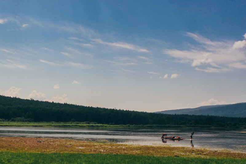 Pływanie w tak czystej wodzie to sama przyjemność. Za zakrętem rzeki dostrzegamy domy - to Ust-Iłga (ros. Усть-Илга). Przyjdzie nam się zmierzyć z sporym odcinkiem na płyciźnie, a wtedy schodzimy z tratwy i ciągniemy ją ostrożnie po powierzchni. Naszym wybawieniem są piankowe buty, pożyczone od przyjaciela, który jest nurkiem. I tak dobijamy do kolejnego brzegu.