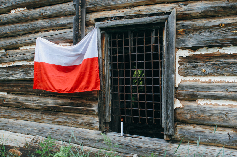 Rozglądamy się po okolicy, dookoła jest kilka baraków, każdy w takim stanie, że boję się wejść (trochę się cykam, cytując klasyka). Gułag został zamknięty prawdopodobnie w latach 60 - w internecie trudno znaleźć cokolwiek na jego temat, ale na jednej z rosyjskojęzycznych stron znalazłem jakąś tam historię tego regionu. Szukamy napisów na drzewach - jeśli była tu Polska inteligencja, na pewno jakiś znajdziemy - wmawiamy sobie. Ale szybko rezygnujemy. W Ust Kutc starsza kobieta – sklepowa- powiedziała nam, że w tym łagrze byli też Polacy. Dlatego wywieszamy polską flagę i zapalamy świeczkę. Robimy sobie zdjęcie. Mam na szczęście mały statyw od Wojtka - przyjaciela któremu tego statywu chyba do dziś nie oddałem. Nie mam pojęcia co się z nim stało, bo do domu z nim wróciłem. To zdjęcie kosztuje nas dużo ukąszeń meszek - nie potrafię zrobić normalnej miny - owady wpadają mi do oczu.